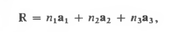 Where R is the resulting point after applying operations in the x, y, and z direction of the lattice. Taking the full set of combinations from this function, we see how these primitive vectors (a1, a2, a3) generate the lattice. Picking a random point R, we can select any combination of the vectors above function (so a1, a2 + a3, etc), and we must arrive at another point in the lattice.