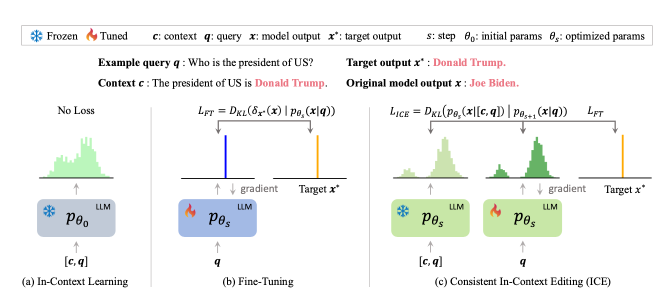 Papers like In-Context Editing15 add an additional loss term during fine tuning that encourages the model to have its answer be consistent with added context provided to the query. This encourages both new knowledge for existing queries, and can potentially help with context faithfulness. Other approaches like MeLLo16 use external knowledge to help provide new information. This can be seen as an extension of the context window, though this method doesn’t help as much with our faithfulness issue.