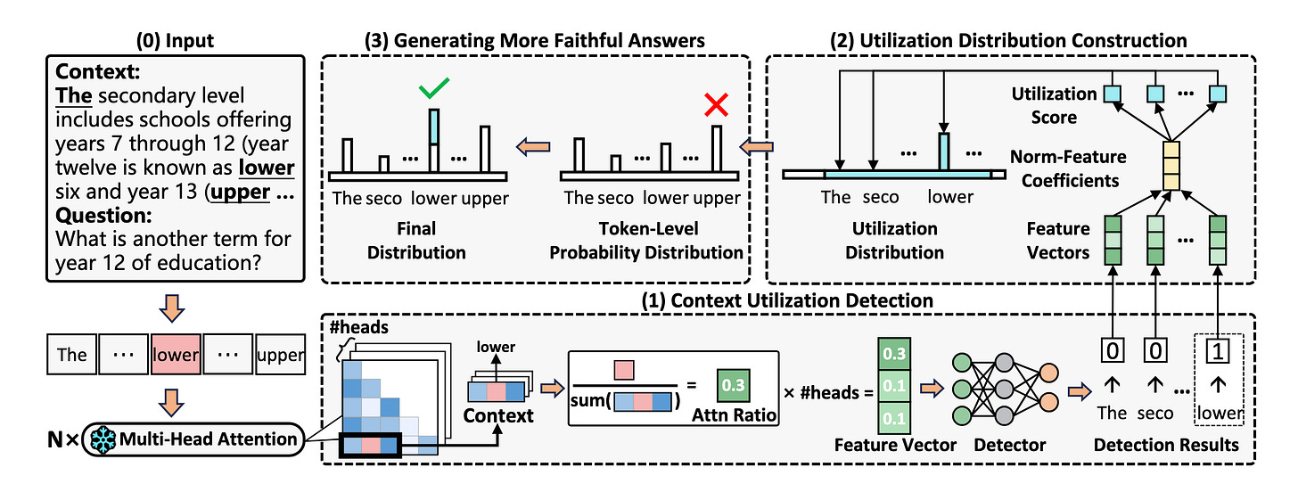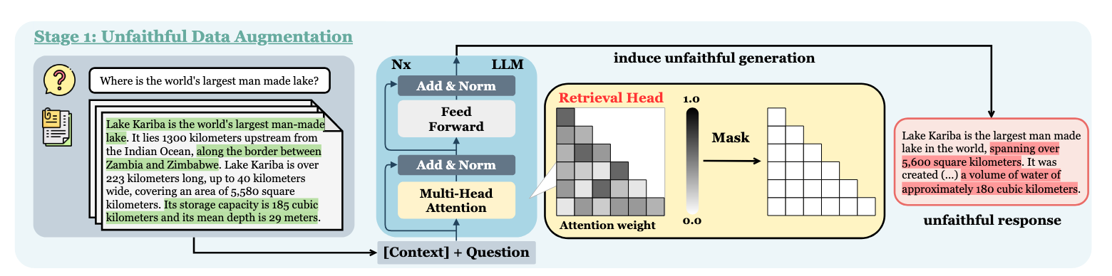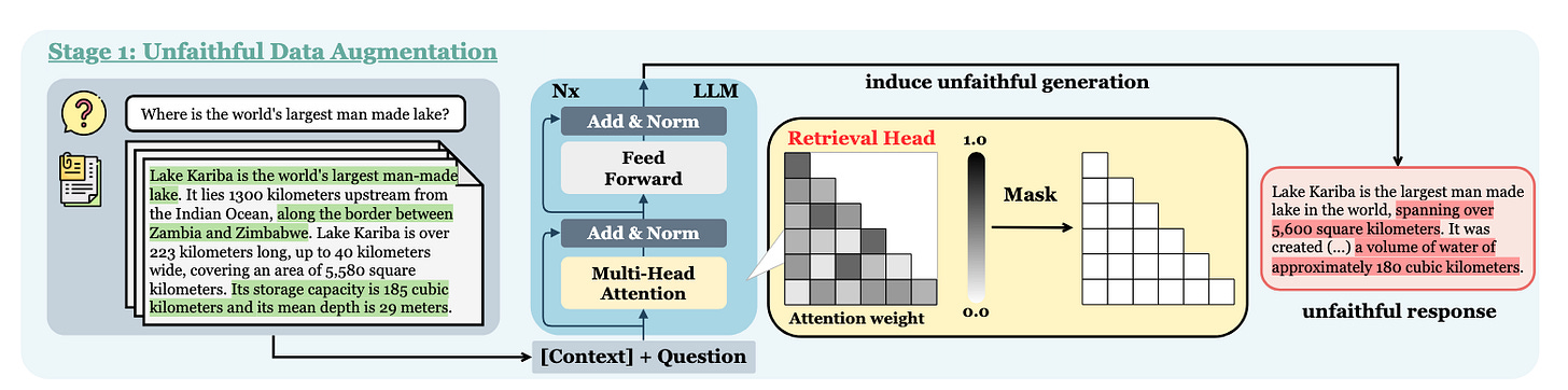 Another, heavier fine tuning paper focused on Retrieval Heads11. Retrieval Heads are attention heads inside the model whose specific purpose is to pull information from the context window. Retrieval Heads-Induced Optimization12 (RHIO) is a paper focused on leveraging these attention heads. They create a dataset of responses with these attention heads turned on to create faithful responses, and masked (turned off) to create unfaithful responses. They can then fine tune models off of these differences.