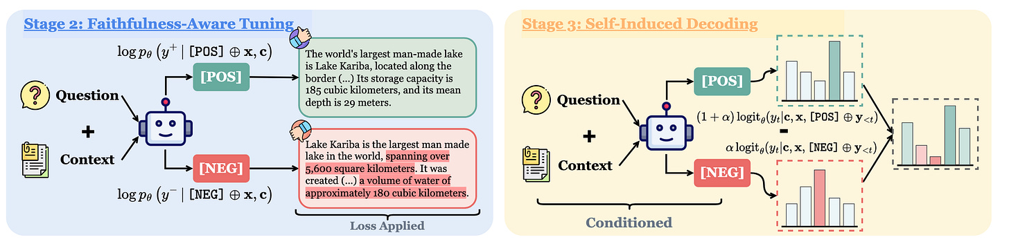 The RHIO paper discussed previously also has a decoding piece to it. They use special control tokens14, in the RHIO paper’s case they use [POS] and [NEG], to signal to the model to generate faithful and unfaithful responses so that they can do self-induced decoding, which is just another name for contrastive decoding where end logit probabilities are adjusted based on both positive and negative generations.