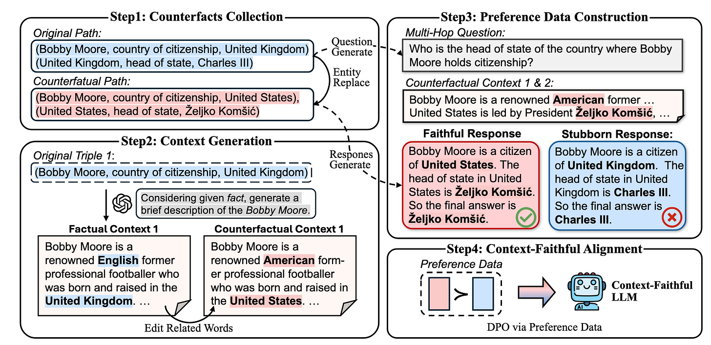 The next step up from prompting strategies is actual fine tuning of the model. The main paper I want to discuss here is Context-DPO10 which uses Direct Policy Optimization on counter factual contexts to improve context faithfulness. They implement this by first extracting fact tuples from wikipedia. Think (John, in, Park) from our earlier discussion of fact-tuples, but for conventionally established facts LLMs are likely to be trained on such as famous musicians or events. They then create a graph based on these tuples, and create questions that require multiple hops. So if we have (John, in, park) and (park, in, Chicago) a 2-hop question might be “What city is John in?”. We then augment these fact tuples to be incorrect. For example, we might change (park, in, Chicago) to (park, in, Los Angeles), and then generate context based on these incorrect tuples. This is important because we want to train the LLM to base it’s answer off what’s in the context window, even if it goes against the LLM’s internal knowledge. This creates a trade off between context faithfulness and internal knowledge that we can tune. They then generate a response based on the incorrect context window as well as the original correct context, and run DPO with preference for the incorrect, but context faithful generation.