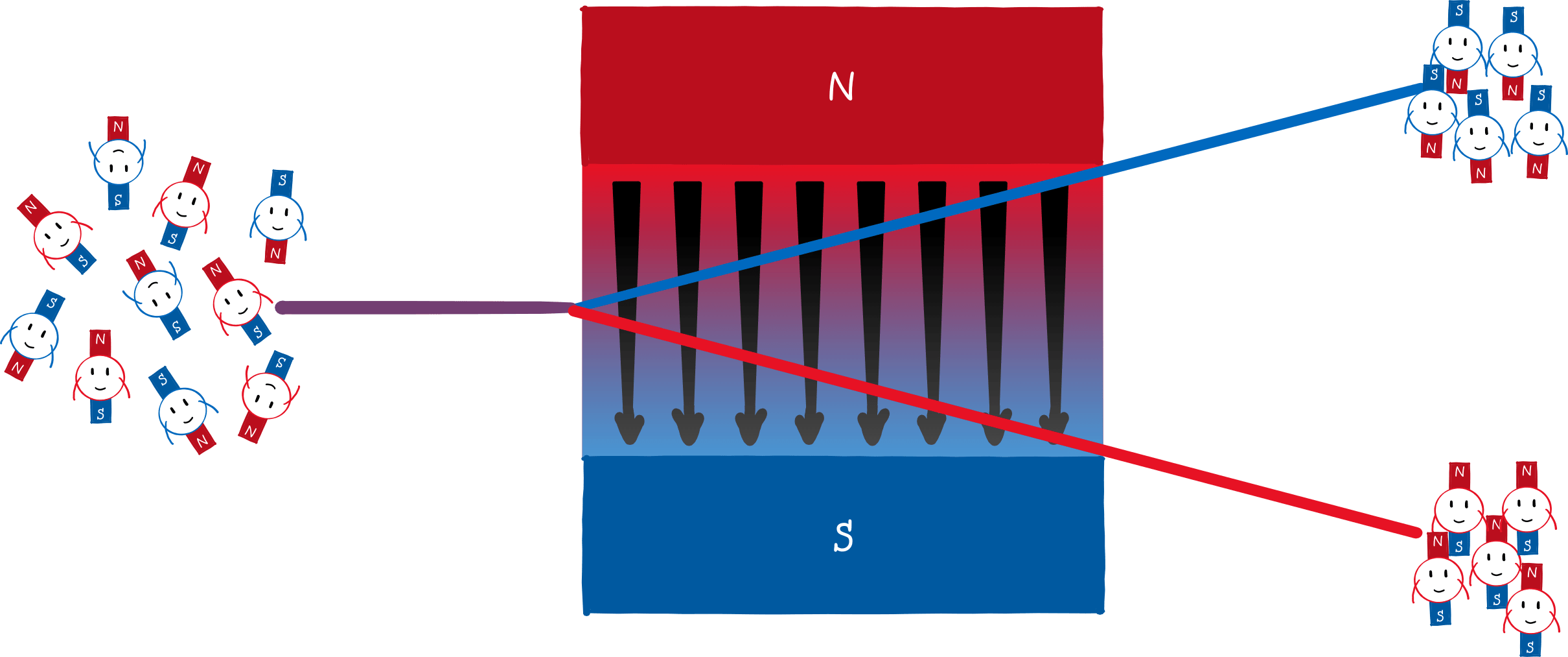 The first topic we will tackle is spin. Spin is an intrinsic attribute to particles like mass is. It’s just something they have. More specifically, it’s a term used to describe a set of behaviors we can’t explain via anything else. Specifically, it has to do with the results of the Stern–Gerlach experiment as seen here: