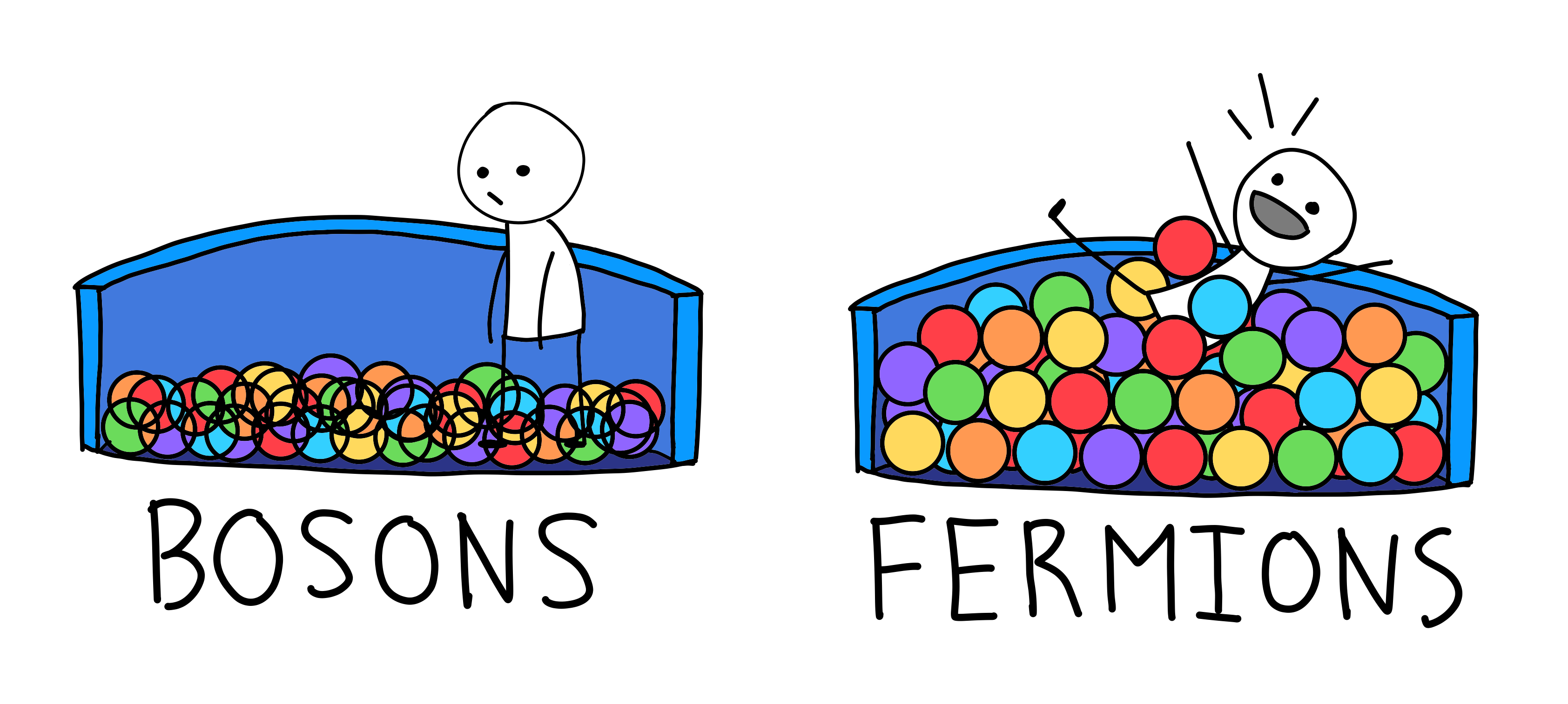 Now let’s talk about Bosons and Fermions. All particles are either Fermions or Bosons. Fermions, in general, are particles of mass (electrons, neutrons, etc) while Bosons are force carrying particles (photons, gluons, etc). The main characterizing difference is wether they abide by the Pauli Exclusion Priciple. The Pauli Exclusion principle states that no two fermions may exist in the same quantum state. Another way to phrase this is that for bosons the wave function is symmetrical, meaning we cannot differentiate them while for fermions it is not symmetrical meaning we can differentiate between them.