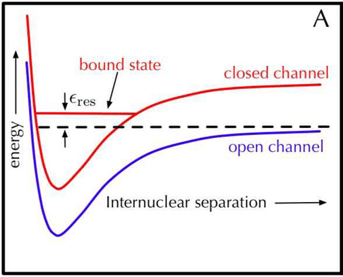 Here we are attempting to align (create resonance) the magnetic potential of the closed channel (εᵣₑₛ) with the scattering length of the open channel (the blacked dash line). A helpful but incorrect analogy might be two magnets. We can either have them attracting (closed channel), or repelling each other (open channel). What we seek to do is put them in a state where they can attract and repel freely depending on the alignment on an external magnetic field. We are attempting to do the same thing here, but utilizing the spin of particles. This is only possible while cold because the cold removes all energy from the system, which greatly lowers the amount of kinetic energy dictating the open system, allowing us to create this resonance between the two. The magnetic field to control this is called the Feshbach resonance.